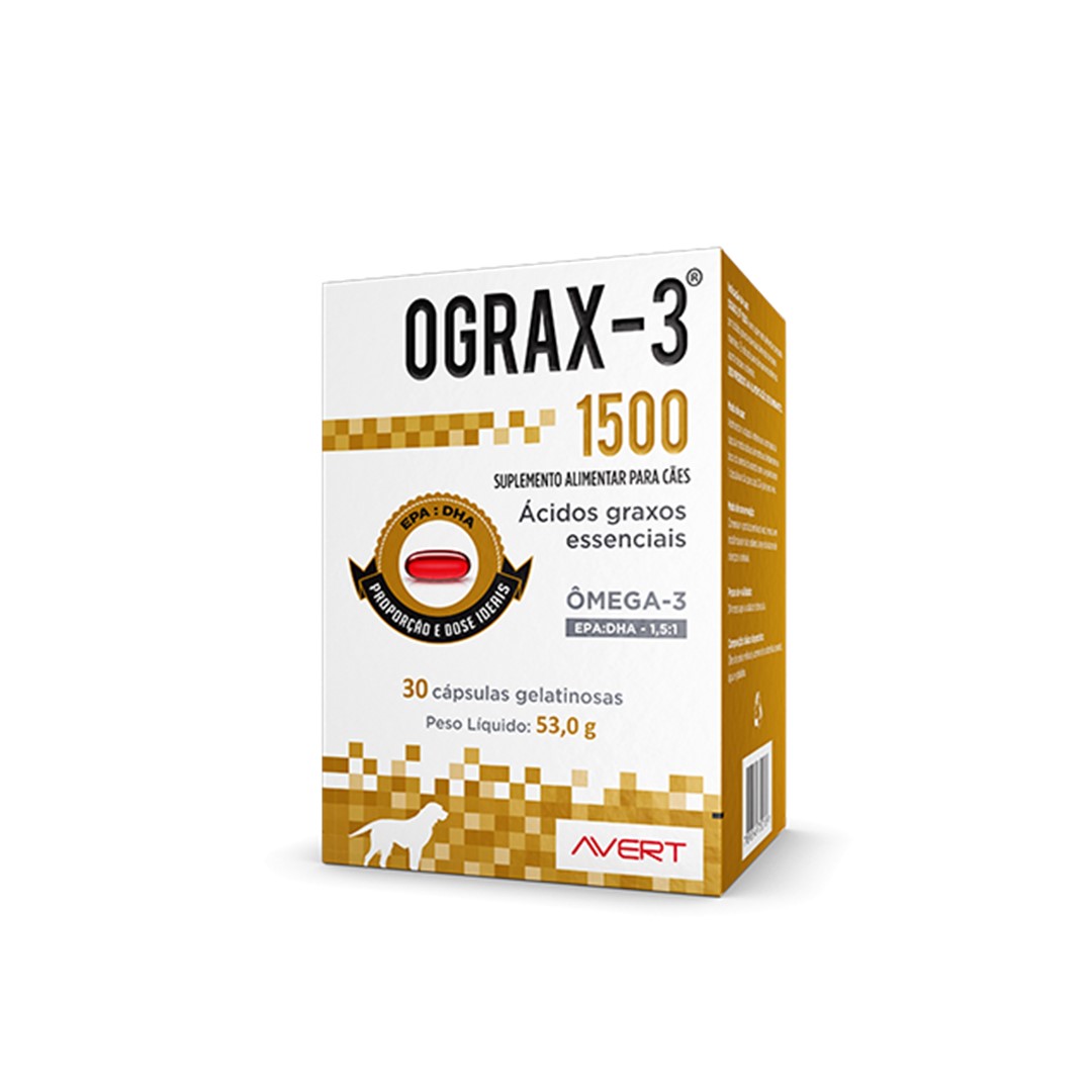 OGRAX-3 1500 é um suplemento alimentar composto por ácidos graxos essenciais derivados de peixes marinhos. É indicado para cães e gatos que necessitem um aporte nutricional desses nutrientes.